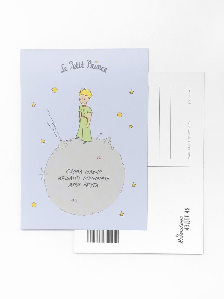 Открытка из плотного дизайнерского картона. На лицевой стороне открытки яркая авторская иллюстрация, вдохновленная произведением "Маленький принц", на обратной стороне есть поле для марки, линовка для адреса и поле для самых тёплых слов и пожеланий.