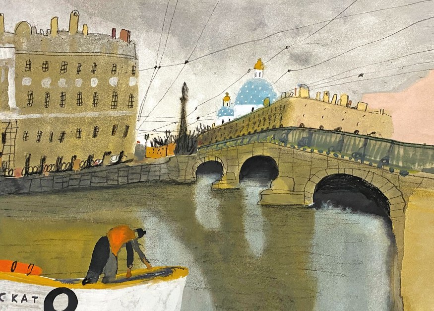 Открытка выполнена из плотного картона. На лицевой стороне иллюстрация Юлии Сидневой с достопримечательностями Санкт-Петербурга, на задней стороне место для марки и линовка для подписи.