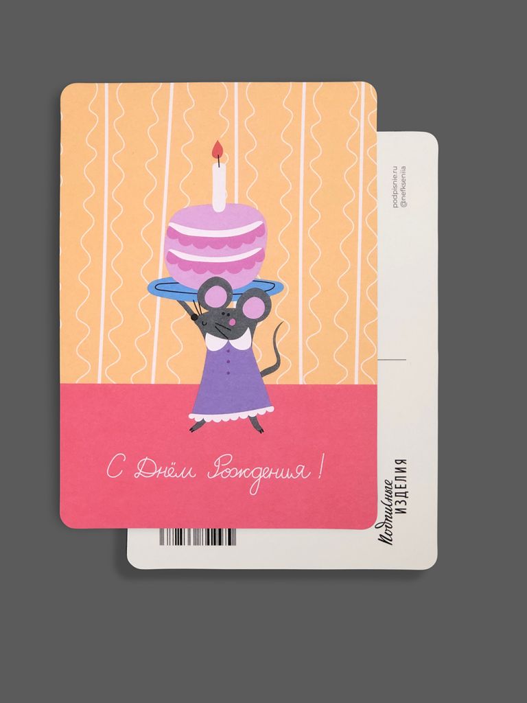 Открытка из плотного дизайнерского картона. На лицевой стороне открытки яркая авторская иллюстрация, на обратной стороне есть поле для марки, линовка для адреса и место для самых тёплых слов и пожеланий.