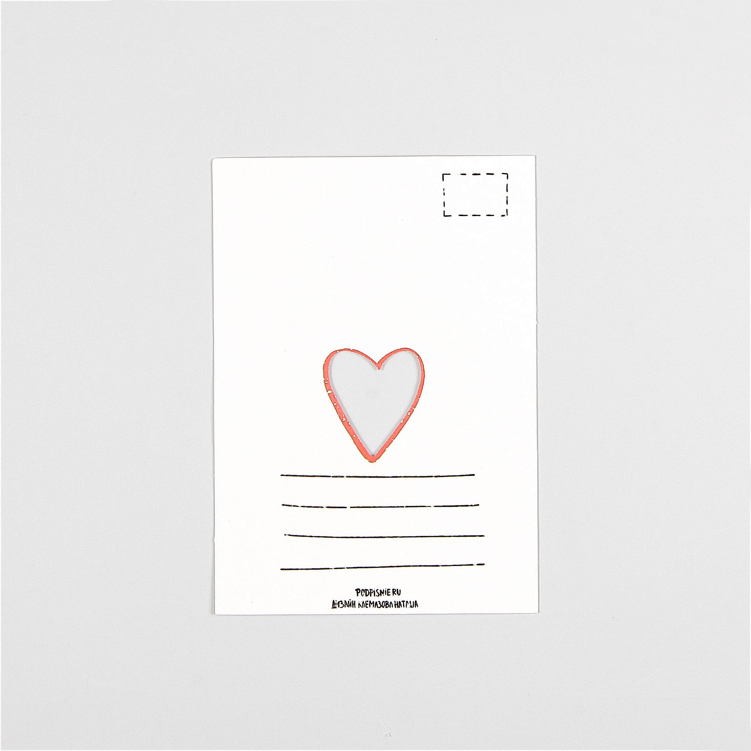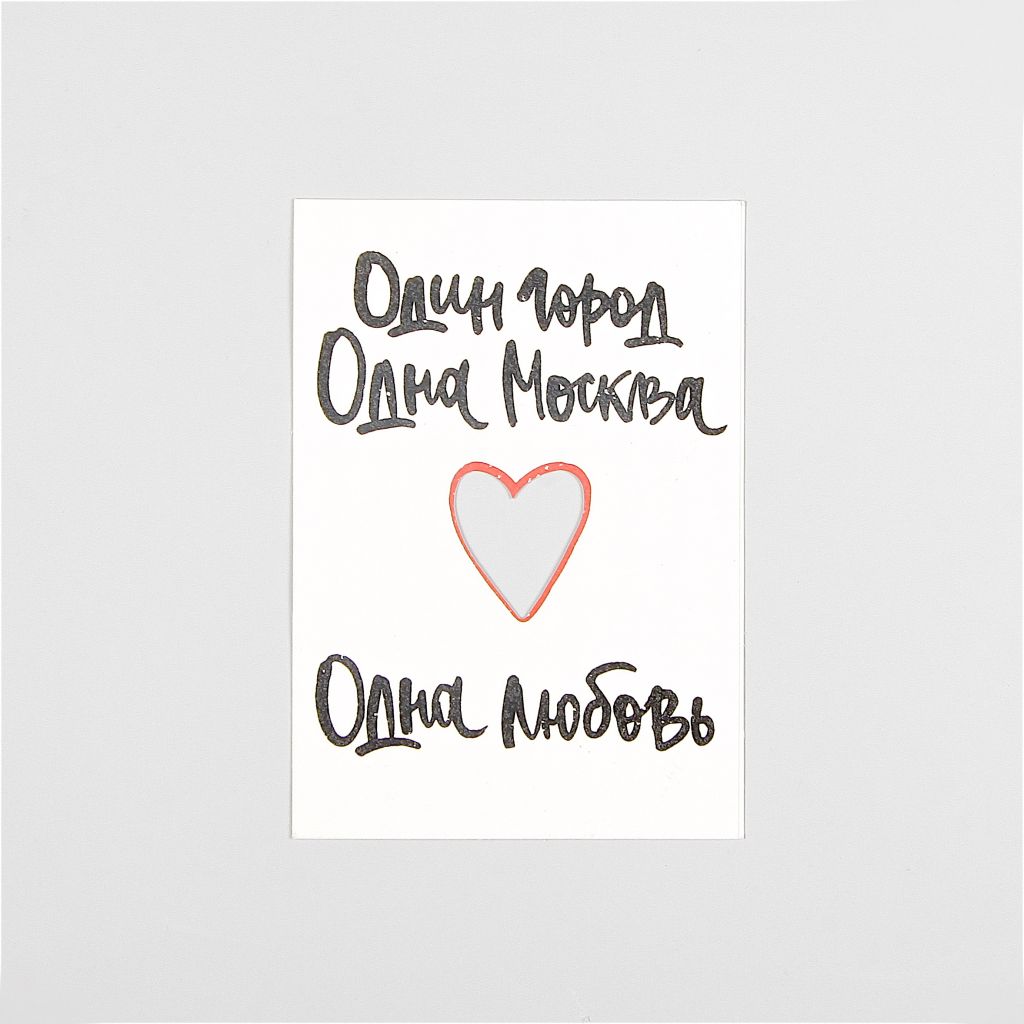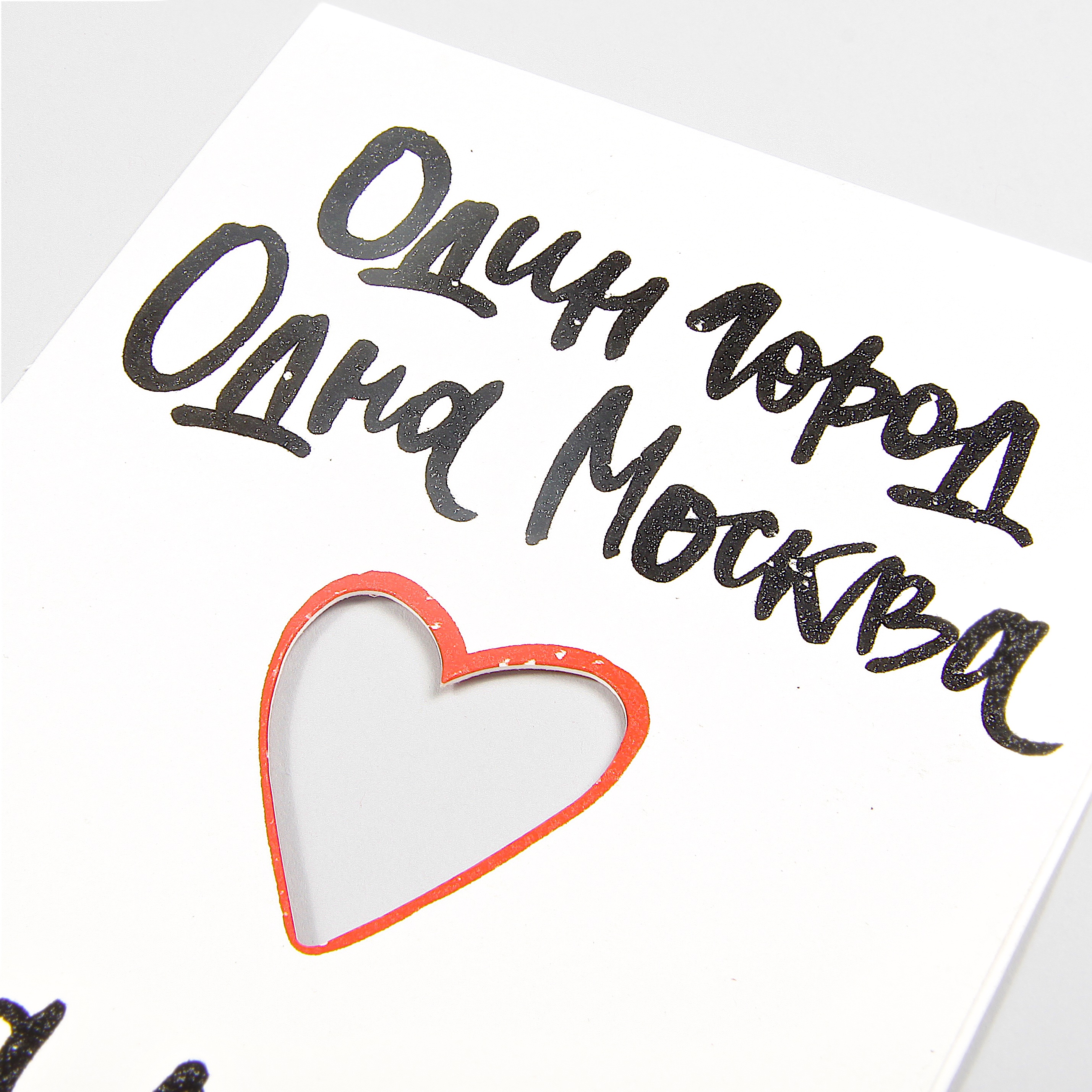 Серия дизайнерских почтовых открыток. Открытка с выштамповкой. Прекрасная почтовая открытка с вырубкой в виде сердца и словами «Один город. Одна Москва. Одна любовь». Выполнена из очень толстого текстурированного белоснежного картона. Дизайн Клемазовой Натальи.