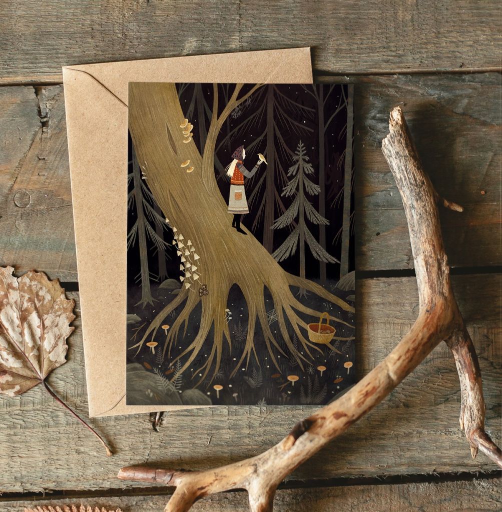 Авторские открытки с иллюстрациями талантливой художницы Александры Дворниковой созданы из плотной хлопковой бумаги, размер открытки стандартный 104х148 мм. На обратной стороне есть линовка для подписи, а также место под марку и адрес получателя. Иллюстрации Александры вдохновлены и наполнены бесконечной любовью к природе, очарованием леса и мистической красотой сказочных существ.