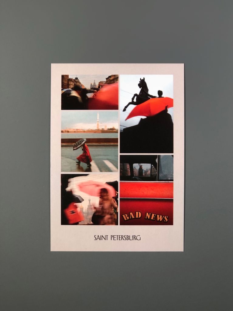 Открытка из плотного картона с коллажем из атмосферных фото Санкт Петербурга. На обратной стороне предусмотрены поля для марки, заполнения адреса получателя и ваших самых тёплых пожеланий и слов.