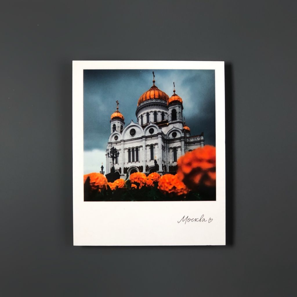 Открытка из серии «Полароид», напечатанная на качественном плотном картоне. На лицевой стороне открытки фото ярких достопримечательностей Москвы. На обратной стороне поле для марки и ваших самых тёплых пожеланий и слов.