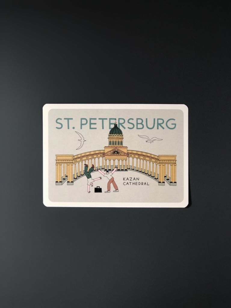 Открытка из плотного дизайнерского картона. На лицевой стороне открытки яркая авторская иллюстрация с достопримечательностями Санкт-Петербурга, на обратной стороне есть поле для марки, линовка для адреса и место для самых тёплых слов и пожеланий.