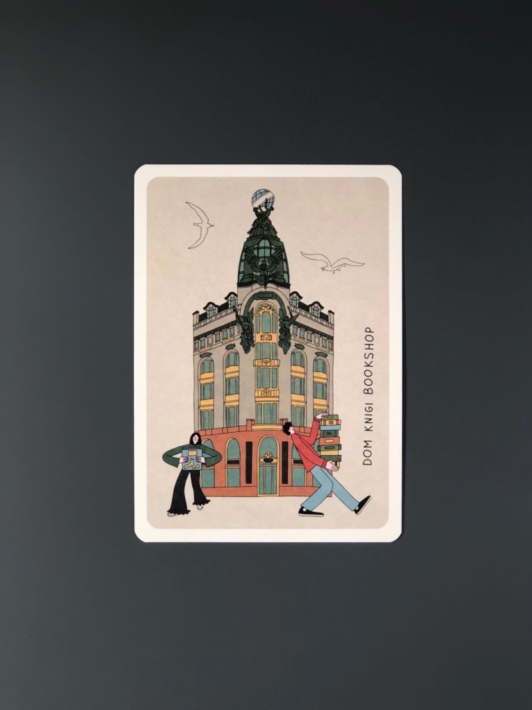 Открытка из плотного дизайнерского картона. На лицевой стороне открытки яркая авторская иллюстрация с достопримечательностями Санкт-Петербурга, на обратной стороне есть поле для марки, линовка для адреса и место для самых тёплых слов и пожеланий.