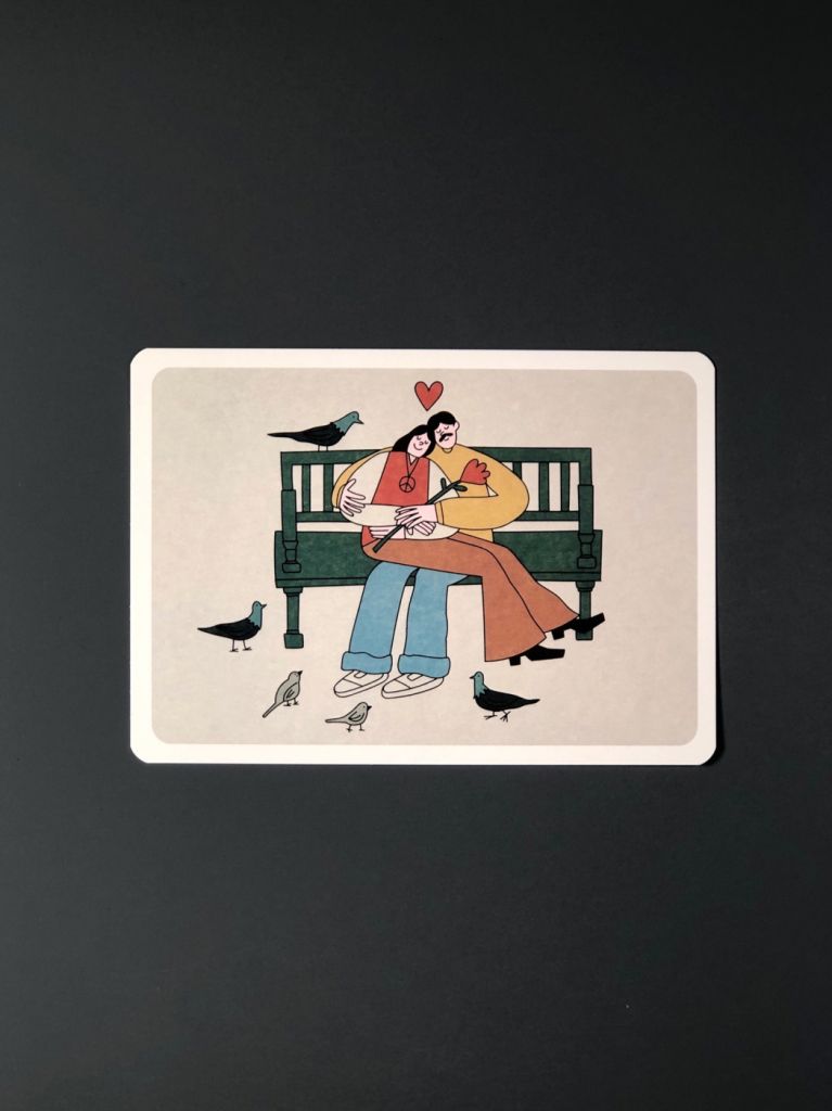 Открытка из плотного дизайнерского картона. На лицевой стороне открытки яркая авторская иллюстрация, на обратной стороне есть поле для марки, линовка для адреса и место для самых тёплых слов и пожеланий.