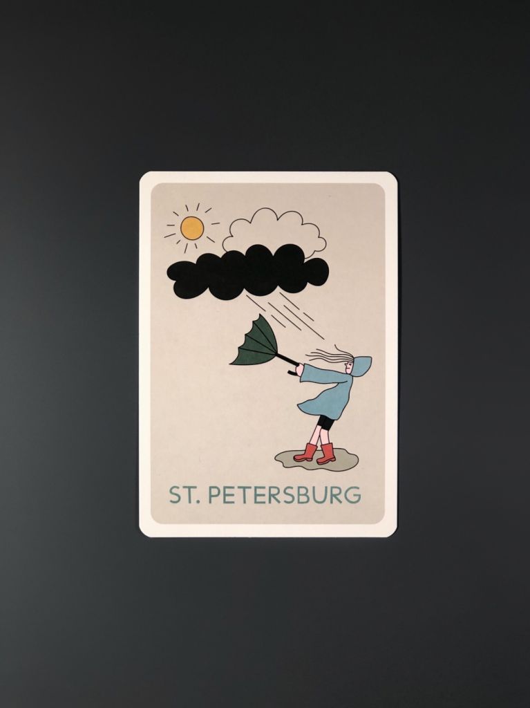 Открытка из плотного дизайнерского картона. На лицевой стороне открытки яркая авторская иллюстрация, на обратной стороне есть поле для марки, линовка для адреса и место для самых тёплых слов и пожеланий.