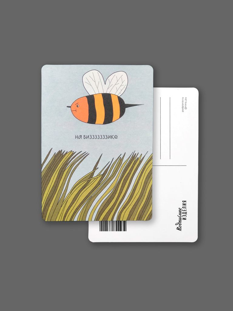 Открытка из плотного дизайнерского картона. На лицевой стороне открытки яркая авторская иллюстрация, на обратной стороне есть поле для марки, линовка для адреса и место для самых тёплых слов и пожеланий.