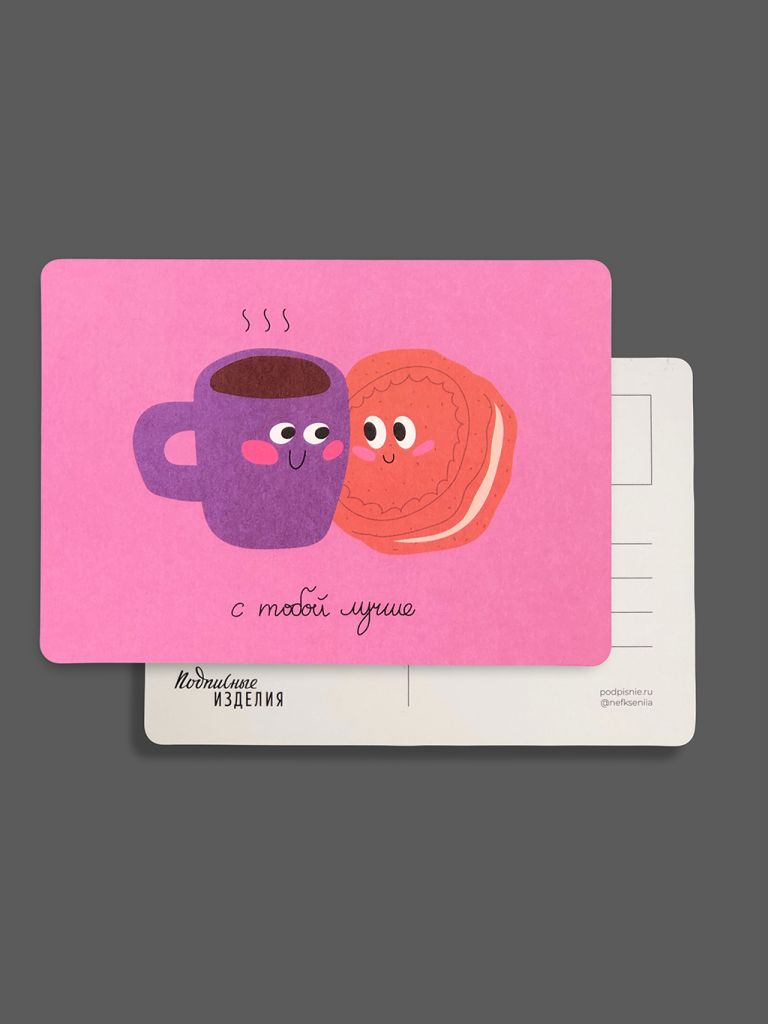 Открытка из плотного дизайнерского картона. На лицевой стороне открытки яркая авторская иллюстрация, на обратной стороне есть поле для марки, линовка для адреса и место для самых тёплых слов и пожеланий.