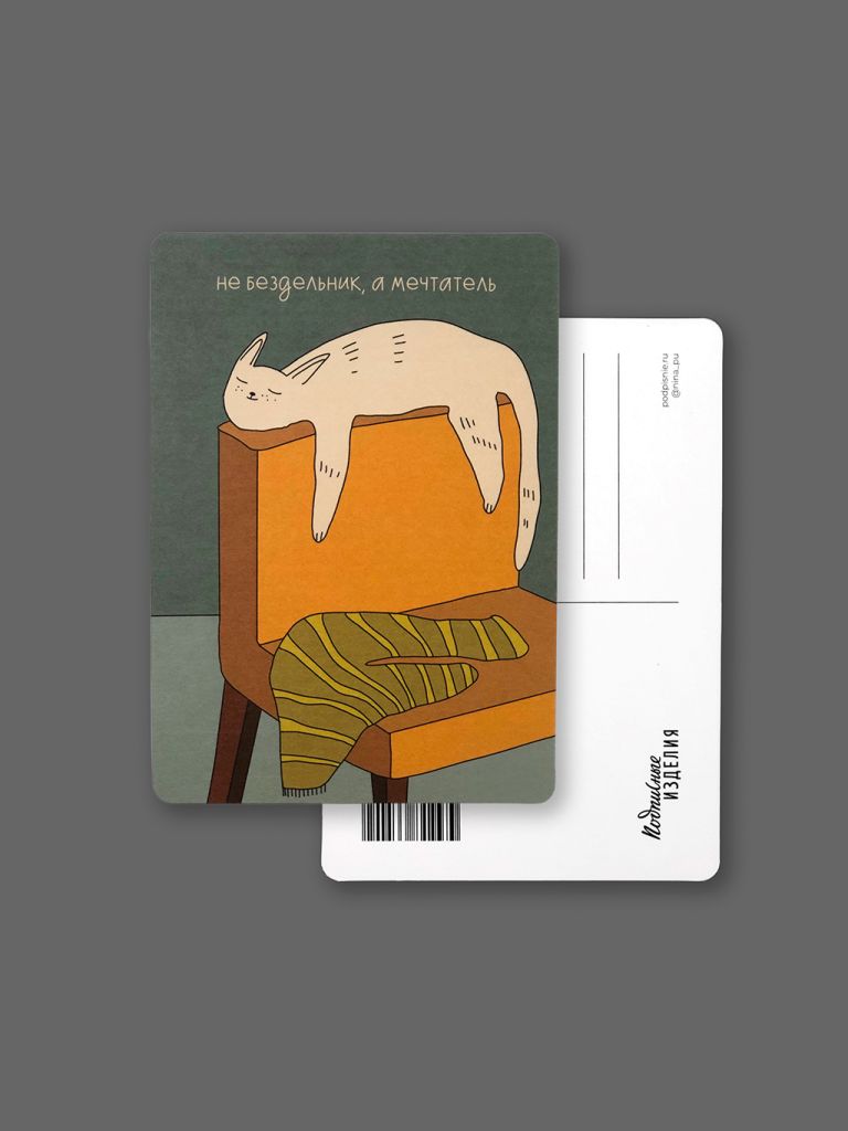 Открытка из плотного дизайнерского картона. На лицевой стороне открытки яркая авторская иллюстрация, на обратной стороне есть поле для марки, линовка для адреса и место для самых тёплых слов и пожеланий.