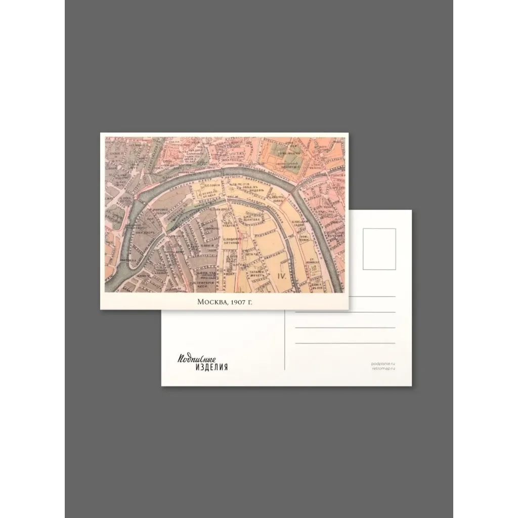 Открытка из плотного дизайнерского картона. На лицевой стороне открытки иллюстрация карты Москвы 1907 года, на обратной стороне есть поле для марки, линовка для адреса и место для самых тёплых слов и пожеланий.