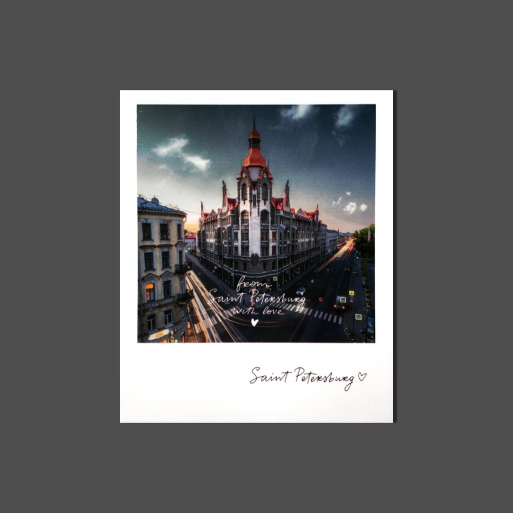 Открытка из серии «Полароид», напечатанная на качественном плотном картоне. На лицевой стороне открытки фото ярких достопримечательностей Санкт-Петербурга. На обратной стороне поле для марки и ваших самых тёплых пожеланий и слов.