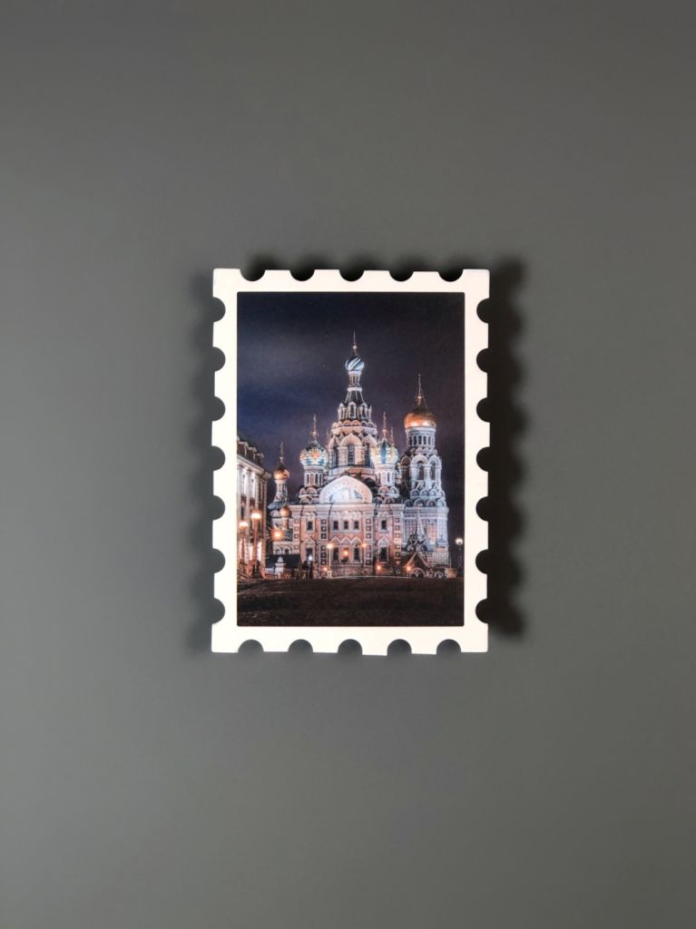 Открытка из плотного картона с краями, стилизованными под марку. На лицевой стороне открытки авторская иллюстрация по мотивам ярких достопримечательностей городов России. На обратной стороне поля для марки, заполнения адреса получателя и ваших самых тёплых пожеланий и слов.