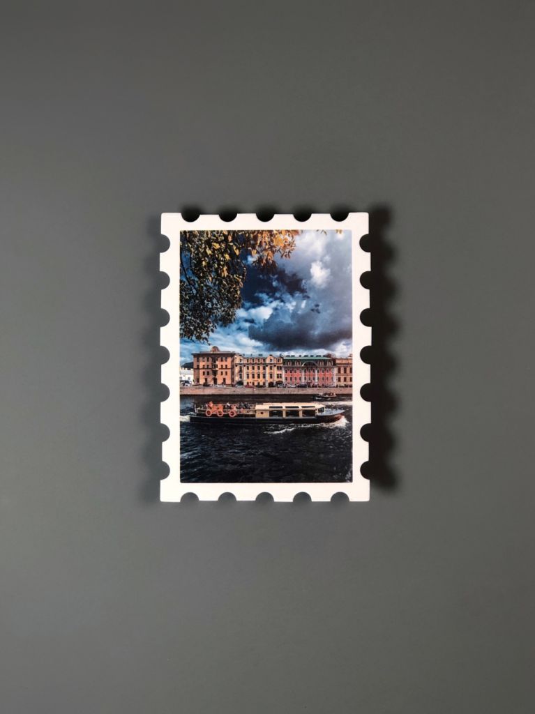 Открытка из плотного картона с краями, стилизованными под марку. На лицевой стороне открытки авторская иллюстрация по мотивам ярких достопримечательностей городов России. На обратной стороне поля для марки, заполнения адреса получателя и ваших самых тёплых пожеланий и слов.