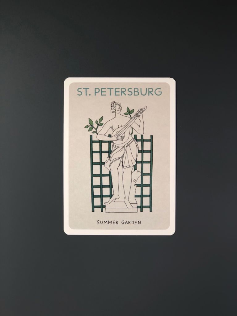 Открытка из плотного дизайнерского картона. На лицевой стороне открытки яркая авторская иллюстрация с достопримечательностями Санкт-Петербурга, на обратной стороне есть поле для марки, линовка для адреса и место для самых тёплых слов и пожеланий.