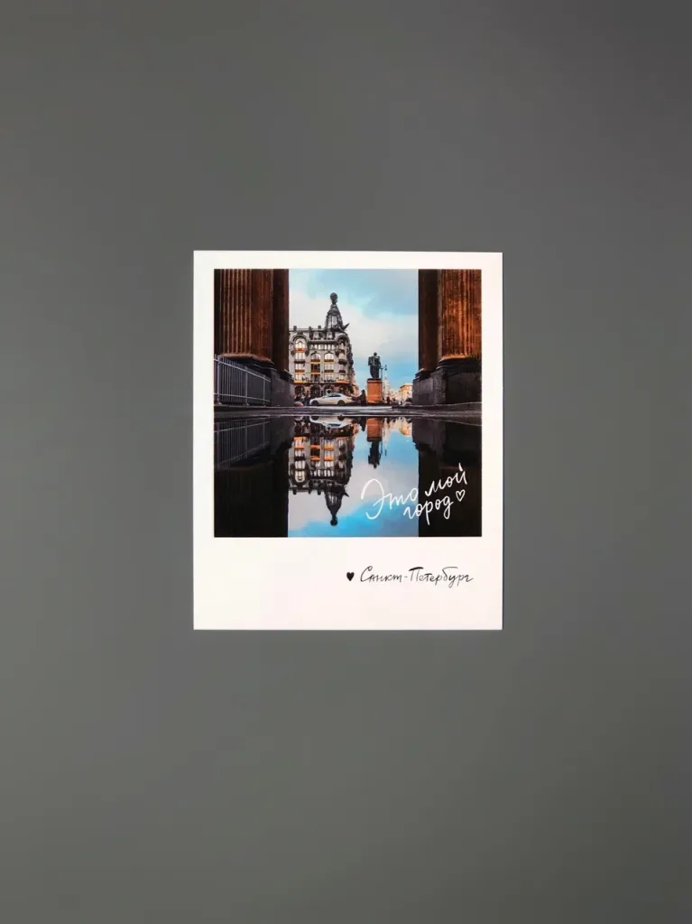 Открытка из серии «Полароид», напечатанная на качественном плотном картоне. На лицевой стороне открытки фото ярких достопримечательностей Санкт-Петербурга. На обратной стороне поле для марки и ваших самых тёплых пожеланий и слов.