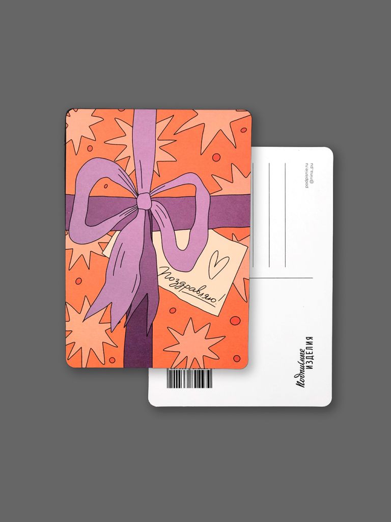 Открытка из плотного дизайнерского картона. На лицевой стороне открытки яркая авторская иллюстрация, на обратной стороне есть поле для марки, линовка для адреса и место для самых тёплых слов и пожеланий.