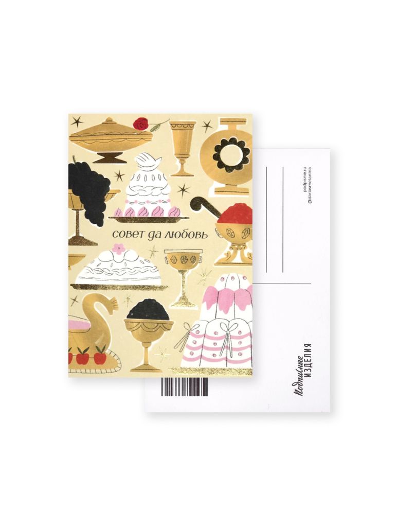 Открытка из плотного дизайнерского картона. На лицевой стороне открытки яркая авторская иллюстрация, на обратной стороне есть поле для марки, линовка для адреса и место для самых тёплых слов и пожеланий.