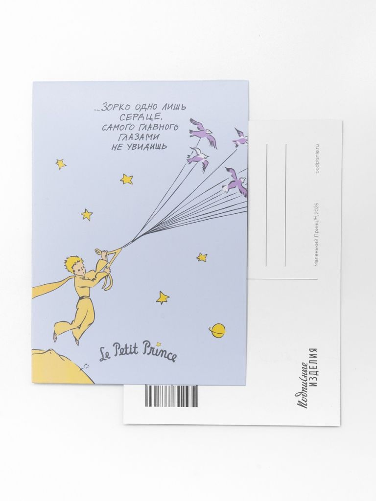 Открытка из плотного дизайнерского картона. На лицевой стороне открытки яркая авторская иллюстрация, вдохновленная произведением "Маленький принц", на обратной стороне есть поле для марки, линовка для адреса и поле для самых тёплых слов и пожеланий.