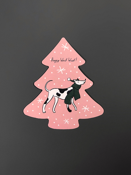 Открытка из плотного дизайнерского картона в форме новогодней ёлочки. На лицевой стороне открытки яркая авторская иллюстрация, на обратной стороне есть поле для марки, линовка для адреса и поле для самых тёплых слов и пожеланий.
