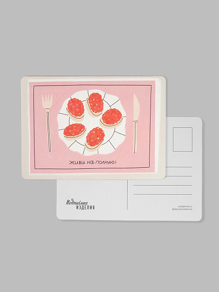 Открытка из плотного дизайнерского картона. На лицевой стороне открытки яркая авторская иллюстрация, на обратной стороне есть поле для марки, линовка для адреса и поле для самых тёплых слов и пожеланий.