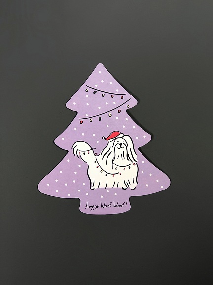 Открытка из плотного дизайнерского картона в форме новогодней ёлочки. На лицевой стороне открытки яркая авторская иллюстрация, на обратной стороне есть поле для марки, линовка для адреса и поле для самых тёплых слов и пожеланий.