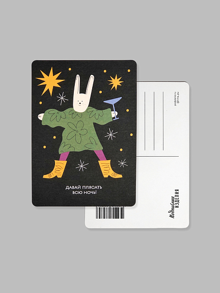 Открытка из плотного дизайнерского картона. На лицевой стороне открытки яркая авторская иллюстрация, на обратной стороне есть поле для марки, линовка для адреса и поле для самых тёплых слов и пожеланий.