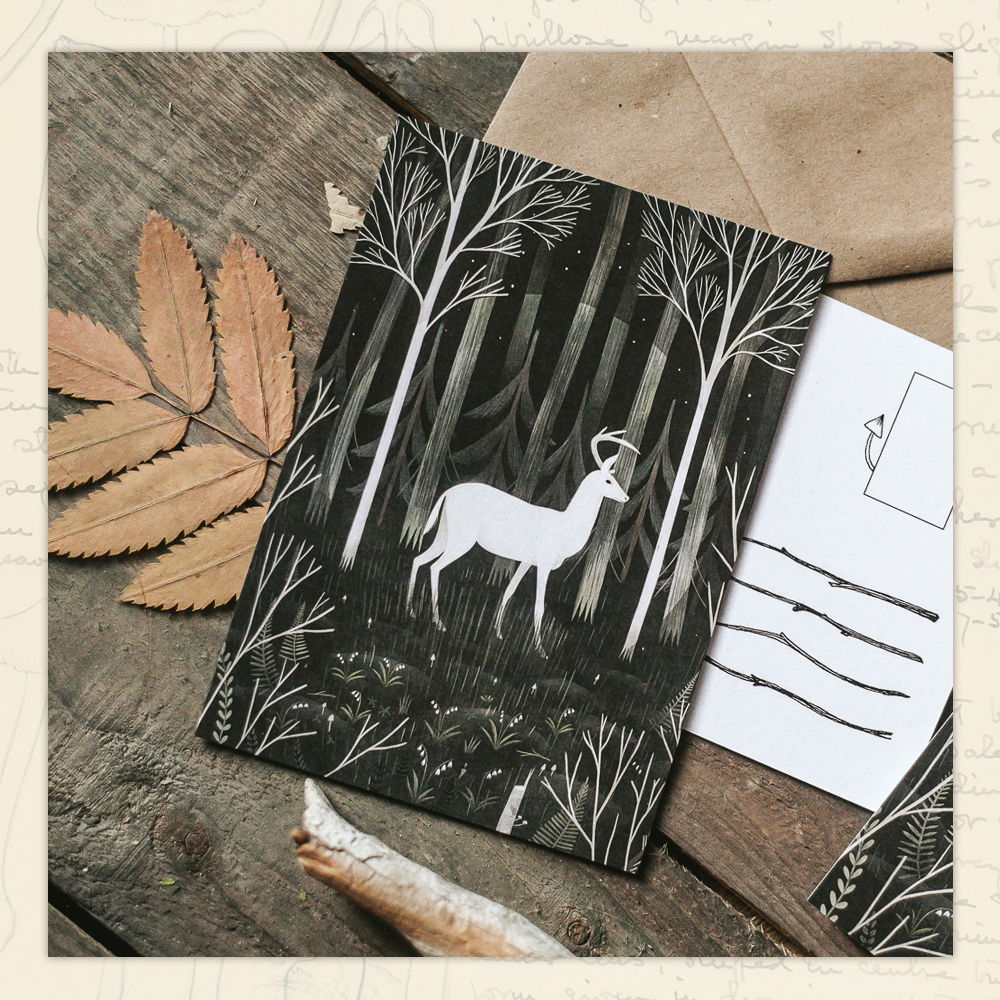 Авторские открытки с иллюстрациями талантливой художницы Александры Дворниковой созданы из плотной хлопковой бумаги, размер открытки стандартный 104х148 мм. На обратной стороне есть линовка для подписи, а также место под марку и адрес получателя. Иллюстрации Александры вдохновлены и наполнены бесконечной любовью к природе, очарованием леса и мистической красотой сказочных существ.
