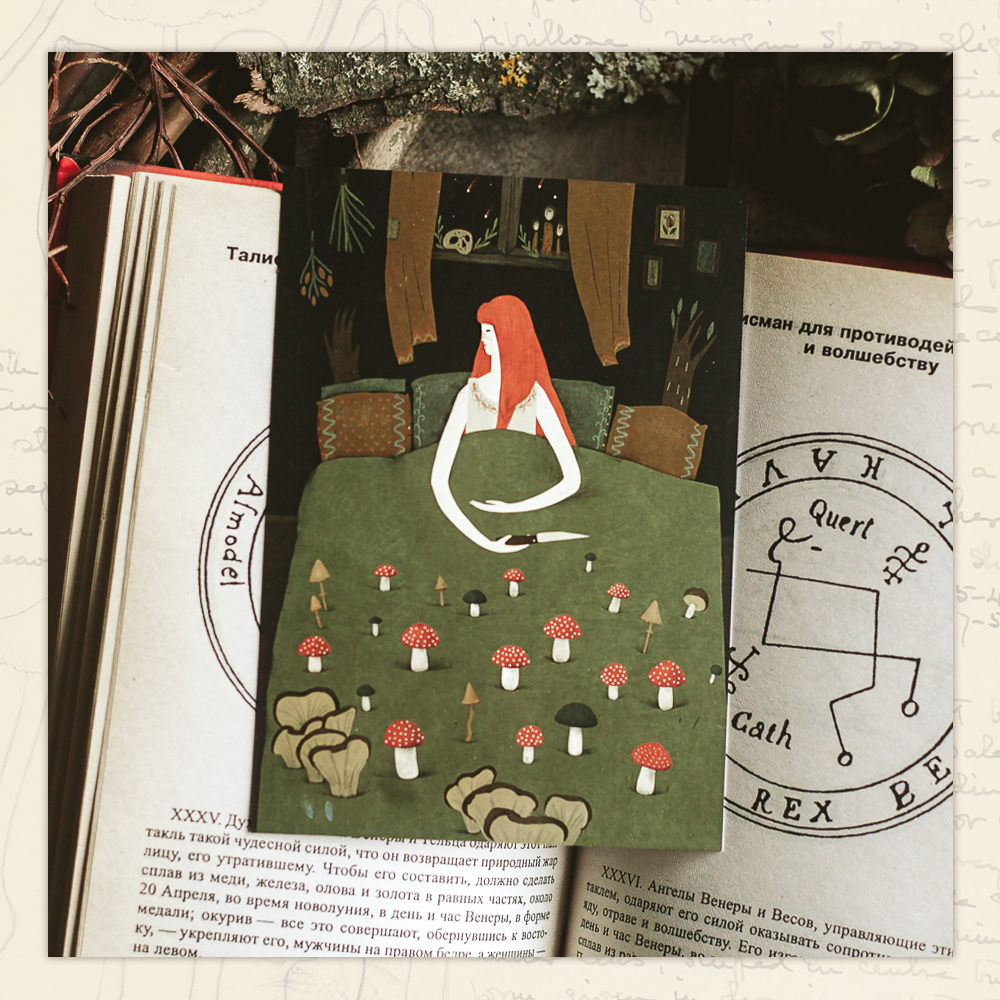 Авторские открытки с иллюстрациями талантливой художницы Александры Дворниковой созданы из плотной хлопковой бумаги, размер открытки стандартный 104х148 мм. На обратной стороне есть линовка для подписи, а также место под марку и адрес получателя. Иллюстрации Александры вдохновлены и наполнены бесконечной любовью к природе, очарованием леса и мистической красотой сказочных существ.