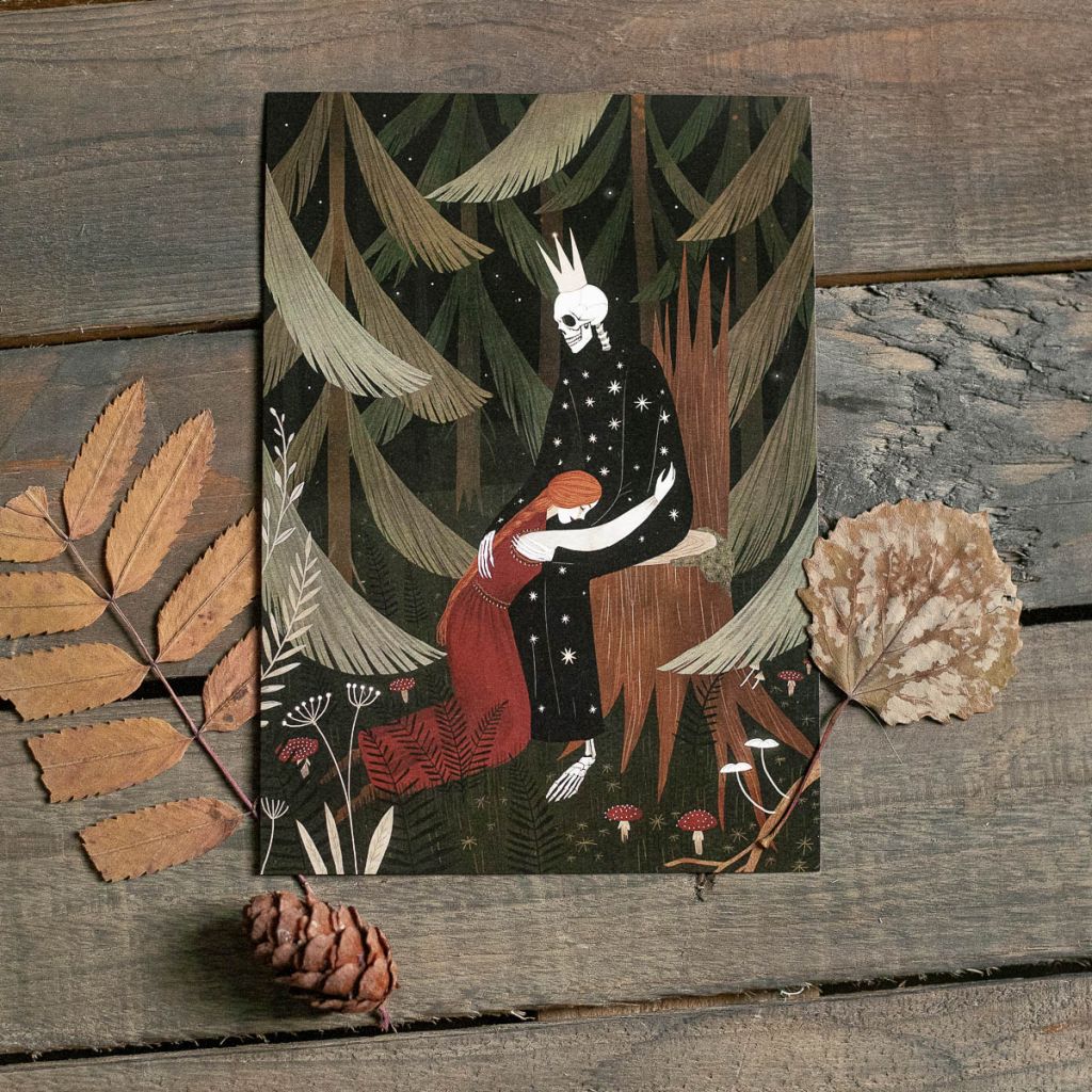 Авторские открытки с иллюстрациями талантливой художницы Александры Дворниковой созданы из плотной хлопковой бумаги, размер открытки стандартный 104х148 мм. На обратной стороне есть линовка для подписи, а также место под марку и адрес получателя. Иллюстрации Александры вдохновлены и наполнены бесконечной любовью к природе, очарованием леса и мистической красотой сказочных существ.