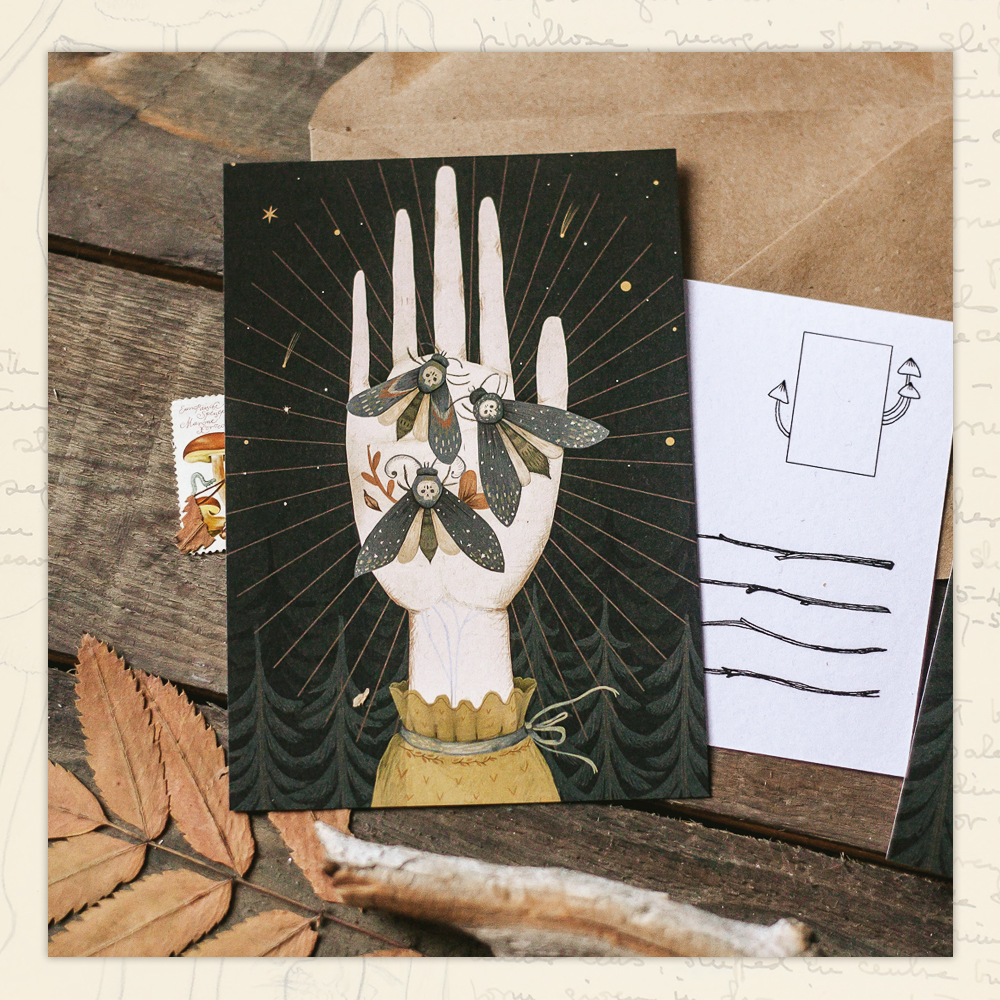 Авторские открытки с иллюстрациями талантливой художницы Александры Дворниковой созданы из плотной хлопковой бумаги, размер открытки стандартный 104х148 мм. На обратной стороне есть линовка для подписи, а также место под марку и адрес получателя. Иллюстрации Александры вдохновлены и наполнены бесконечной любовью к природе, очарованием леса и мистической красотой сказочных существ.