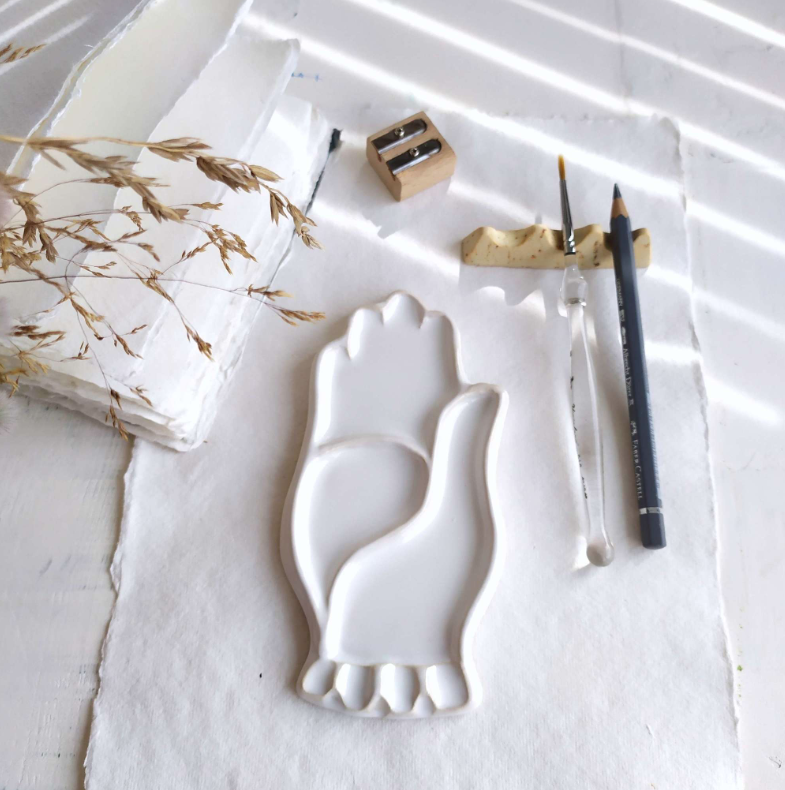 Палитра для рисования "ЛАДОНЬ" в форме руки. Белая глянцевая поверхность идеальна для смешивания любых красок, как водорастворимых, так и на основе любого другого связующего. Палитра "ЛАДОНЬ" будет вам помощницей на пленэрах и в городском скетчинге, так как имеет небольшой вес и компактную форму. Украсит любое рабочее место, станет уникальной деталью на ваших фото, а так же вдохновит на творческий процесс. Упакована в текстильный мешочек для хранения и транспортировки. Технические характеристики: • размер: 16 см. х 8 см. • легковесна: 130 грамм . • материал : керамика, глазурь белая глянцевая. • идеально видны цвета краски, легко моется • антискользящие силиконовые ножки Особенности ухода за палитрой: Рабочая, глазурованная часть палитры легко очищается при помощи воды и мыла. При работе с масляной краской, остатки можно удалить с помощью растворителя. Тыльная часть палитры-не покрыта глазурью и может впитывать пигмент. Палитру не рекомендуется мыть в посудомоечной машине и чистить рабочую поверхность абразивными средствами. В течении времени на поверхности глазури может (*в редких случаях) появиться кракле (микро трещины), но не всегда. Это особенность материала и технологии. Это не влияет на целость палитры и не является браком.