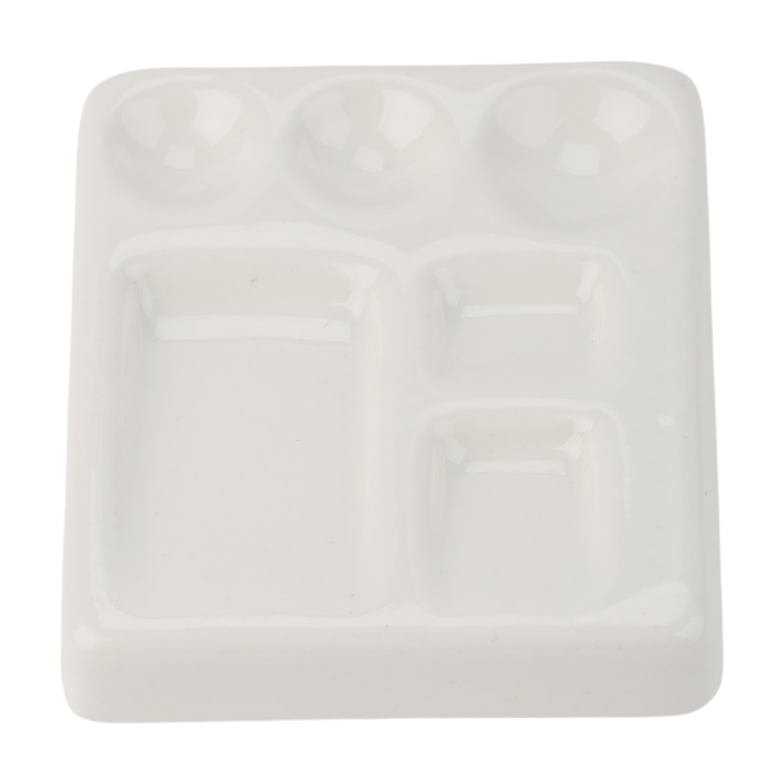 Палитра состоит из 6 ячеек, одна из которых увеличенных размеров, предназначена для смешивания цветов. Рекомендуется к использованию в работе акварельными, гуашевыми и акриловыми красками. Палитра легко моется и не впитывает пигменты краски. Размер палитры 7,5х 8,5х1,4 см.