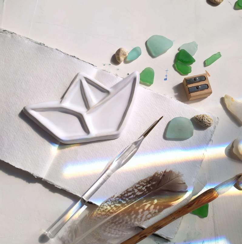 Палитра художественная "Кораблик" пополняет серию палитр для скетчинга. Романтическая вдохновляющая форма палитры, повторяет очертания бумажного кораблика. Компактная и легкая, палитра весит всего 115 грамм. Всегда удобно взять с собой. Палитра "КОРАБЛИК" надежная помощница в настольном творчестве - имеет 4 отдельных пространства для смешивания красок акварели гуаши акрила. В комплекте хлопковый мешочек для транспортировки и хранения. Характеристики: • размер: 14 см. х 9 см. • легковесна: 115 грамм . • идеально видны цвета краски, легко моется • антискользящие силиконовые ножки Особенности ухода за палитрой: Рабочая, глазурованная часть палитры легко очищается при помощи воды и мыла. При работе с масляной краской, остатки можно удалить с помощью растворителя. Тыльная часть палитры-не покрыта глазурью и может впитывать пигмент. Палитру не рекомендуется мыть в посудомоечной машине и чистить рабочую поверхность абразивными средствами. В течении времени на поверхности глазури может (*в редких случаях) появиться кракле (микро трещины), но не всегда. Это особенность материала и технологии. Это не влияет на целость палитры и не является браком.