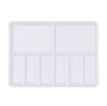 Пластиковая прямоугольная палитра предназначена для живописных работ различными видами красок.6 ячеек для краски, 2 зоны для смешивания Размер 11х15 см.