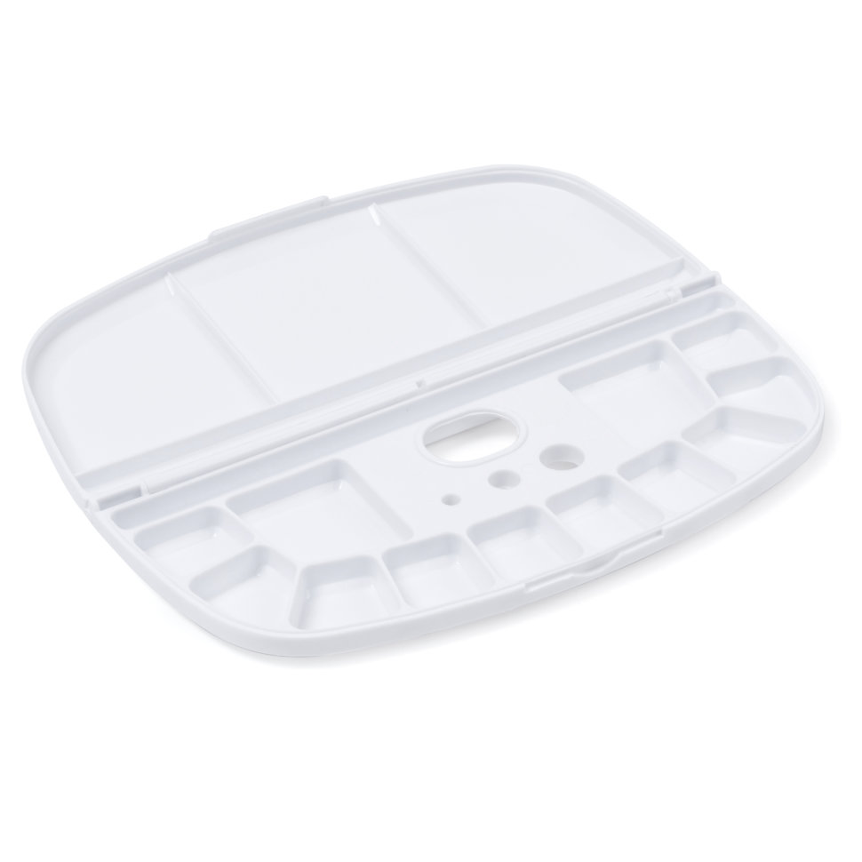 Легкая практичная палитра из белоснежного пластика — настоящий друг и помощник любого художника. Легкий вес, закрывающаяся конструкция и множество ячеек, в дополнение три отверстия под кисти и отверстие для большого пальца для максимально комфортной работы как в студии, так и на пленэрах. Размер палитры: 10х23 см.