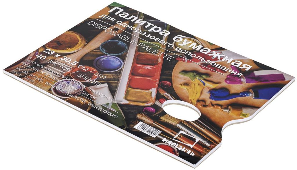 Удобная одноразовая палитра "Малевичъ", предназначенная для любых видов красок, позволяет вовсе не беспокоиться о ее чистоте, полностью отдавшись процессу творчества. После завершения сеанса живописи использованную палитру можно просто выбросить. Одноразовая палитра "Малевичъ" представляет собой альбом из 40 отрывных листов плотной бумаги. Благодаря анатомически выверенным вырезам она удобно ложится в руку, делая процесс живописи легким и комфортным. Белый цвет бумаги позволяет оценить, как смешиваемый оттенок краски будет выглядеть на белом холсте или картоне.