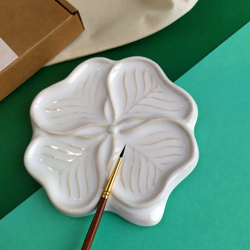 Палитра художественная "СЧАСТЛИВЫЙ КЛЕВЕР" в форме приносящего удачу четырехлистника. Палитра сделана из керамики , обладает легким весом и компактной формой, а белое глянцевое покрытие делает ее идеальной для смешивания акварельных, гуашевых или акриловых красок. 4 изолированных друг от друга пространства помогут вам одновременно работать с разными цветовыми гаммами. Что бы кисть не скатывалась и не пачкала стол, вы можете расположить ее в основании палитры, у стебелька. Палитра "СЧАСТЛИВЫЙ КЛЕВЕР" упакована в удобный тканевый мешочек для хранения и транспортировки. Прекрасный подарок для себя и рисующих людей, символ успеха и везения. Технические характеристики: • размер: 13 см. х 13 см. • легковесна: 125 грамм . • материал : керамика, глазурь белая глянцевая. • идеально видны цвета краски, легко моется • антискользящие силиконовые ножки Особенности ухода за палитрой: Рабочая, глазурованная часть палитры легко очищается при помощи воды и мыла. При работе с масляной краской, остатки можно удалить с помощью растворителя. Тыльная часть палитры-не покрыта глазурью и может впитывать пигмент. Палитру не рекомендуется мыть в посудомоечной машине и чистить рабочую поверхность абразивными средствами. В течении времени на поверхности глазури может (*в редких случаях) появиться кракле (микро трещины), но не всегда. Это особенность материала и технологии. Это не влияет на целость палитры и не является браком.