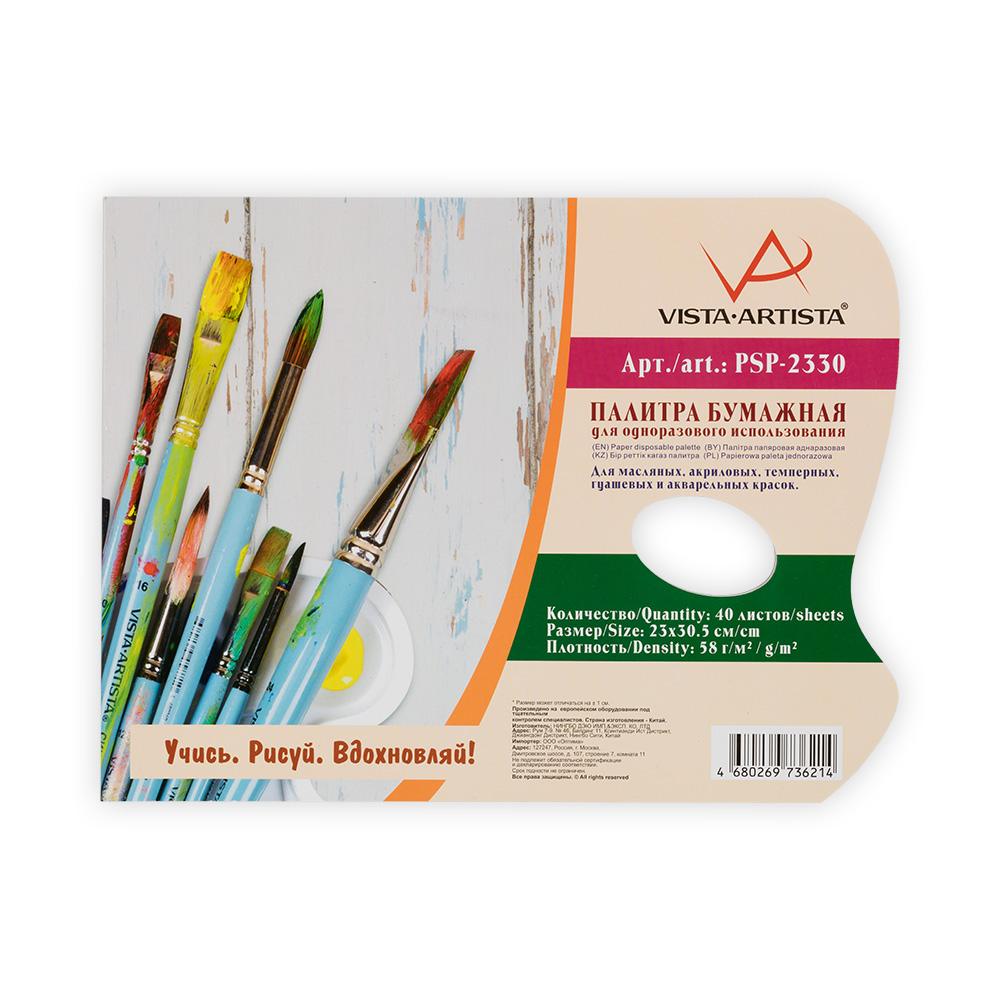 Бумажная палитра для одноразового использования. Представляет собой альбом с отрывными влагостойкими листами. Подходит для работы с масляными, акриловыми, гуашевыми, темперными и акварельными красками.