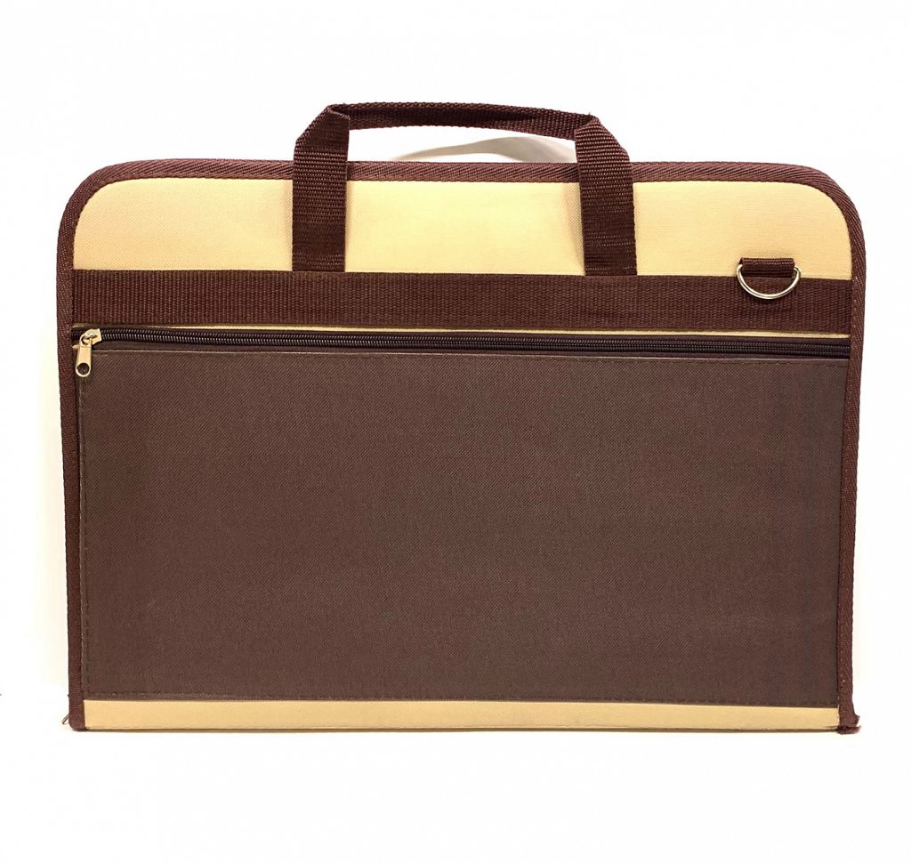 Папка под формат А3. Для производства использован полиэстер бежевого цвета (для кармана коричневый), такой материал хорошо сохраняет форму и не нуждается в специальном уходе. Внутри папки эластичная отстегивающаяся лента для фиксации листов. По периметру папка застегивается на широкую молнию. Для удобства переноски имеется две ручки и наплечный ремень. Предусмотрен небольшой наружный карман на молнии. Применение: папка произведена для переноски и хранения папок с бумагой, отдельных листов и завершенных работ на бумаге. Папка удобна для переноски и хранения. Производство: изготовлена компанией Эстадо в городе Воронеже.