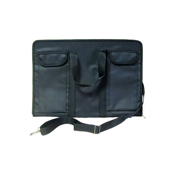 Папка "Художник" формата А3. Размер: 475х325х30 мм. Внутри папки эластичная отстегивающаяся лента для крепления листов. По периметру папка закрывается на широкую застежку "молнию", создающую дополнительный объем. На лицевой стороне расположены два кармана для мелких принадлежностей. Снабжена ручками и регулируемым наплечным ремнем для удобства переноски. По дну жесткая планка шириной 3 см. Цвет - черный.
