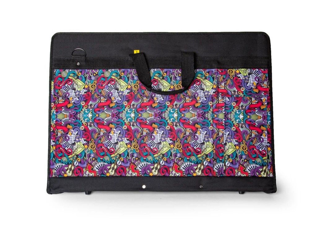 Папка "Художник" формата А2, размеры 650*470*60. Цвет - "Праздник". С внешней стороны папки два объемных кармана - узкий под кисти (150*310) и широкий (490*310) с клапаном, закрывающихся на ленту "велькро". Внутри съемный блок-разделитель для листов. Папка оснащена ручками и регулируемым ремнем для переноски. По дну жесткая планка шириной 6 см.