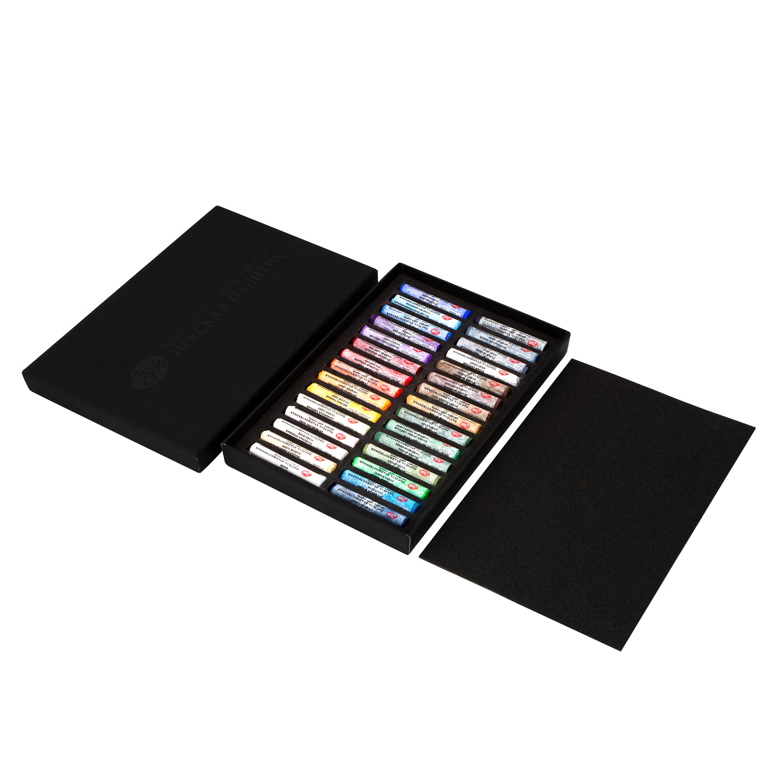 О серии: сухая пастель «Мастер-Класс» изготавливается из мелкотертых пигментов и высококачественного связующего вещества. Пастель обладает оптимальной мягкостью и яркими цветами. Легко растушевывается и смешивается между собой. Хорошо ложится на текстурные поверхности. Для работы рекомендуется использовать специальную бумагу для пастели. Для наибольшей сохранности готовых работ советуем использовать фиксатив. Цвета в наборе: Белая, Неаполитанская телесная, Петербургская розовая, Телесная розовая, Лимонная светлая, Желтая темная, Оранжевая светлая, Киноварь (имитация), Красная средняя, Краплак красный, Фиолетовая светлая, Фиолетовая, Кобальт синий (имитация), Кобальт синий средний (имитация), Ультрамарин, Берлинская лазурь, Морская волна, Зеленая яркая, Зеленая темная, Окись хрома, Окись хрома светлая, Оливковая зеленая, Охра золотистая, Сиена жженая темная, Капут-мортуум, Умбра жженая, Серая светлая, Серая темная, Нейтрально-серая, Черная холодная. Характеристики: мягкая художественная пастель. Почти не крошится, оставляет бархатистый приятный след. Применение: для графических работ. Возможно использование совместно с другими графическими материалами и в смешанных техниках.