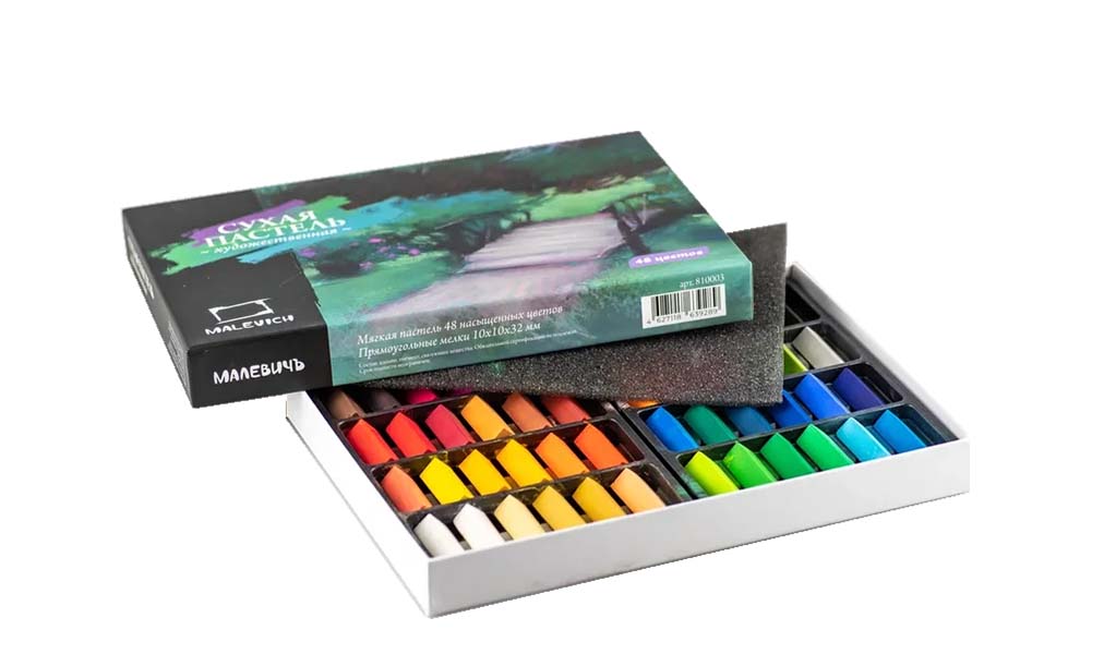 Сухая пастель бренда Малевичъ произведена с использованием оптимального количества пигмента и связующего вещества, что обеспечивает яркий насыщенный цвет и отличные показатели светостойкости. Пастель обладает средней мягкостью, цвета отлично смешиваются между собой, позволяя создавать плавные переходы и новые цветовые сочетания. В наборе 48 цветов квадратных 1/5 мелков.