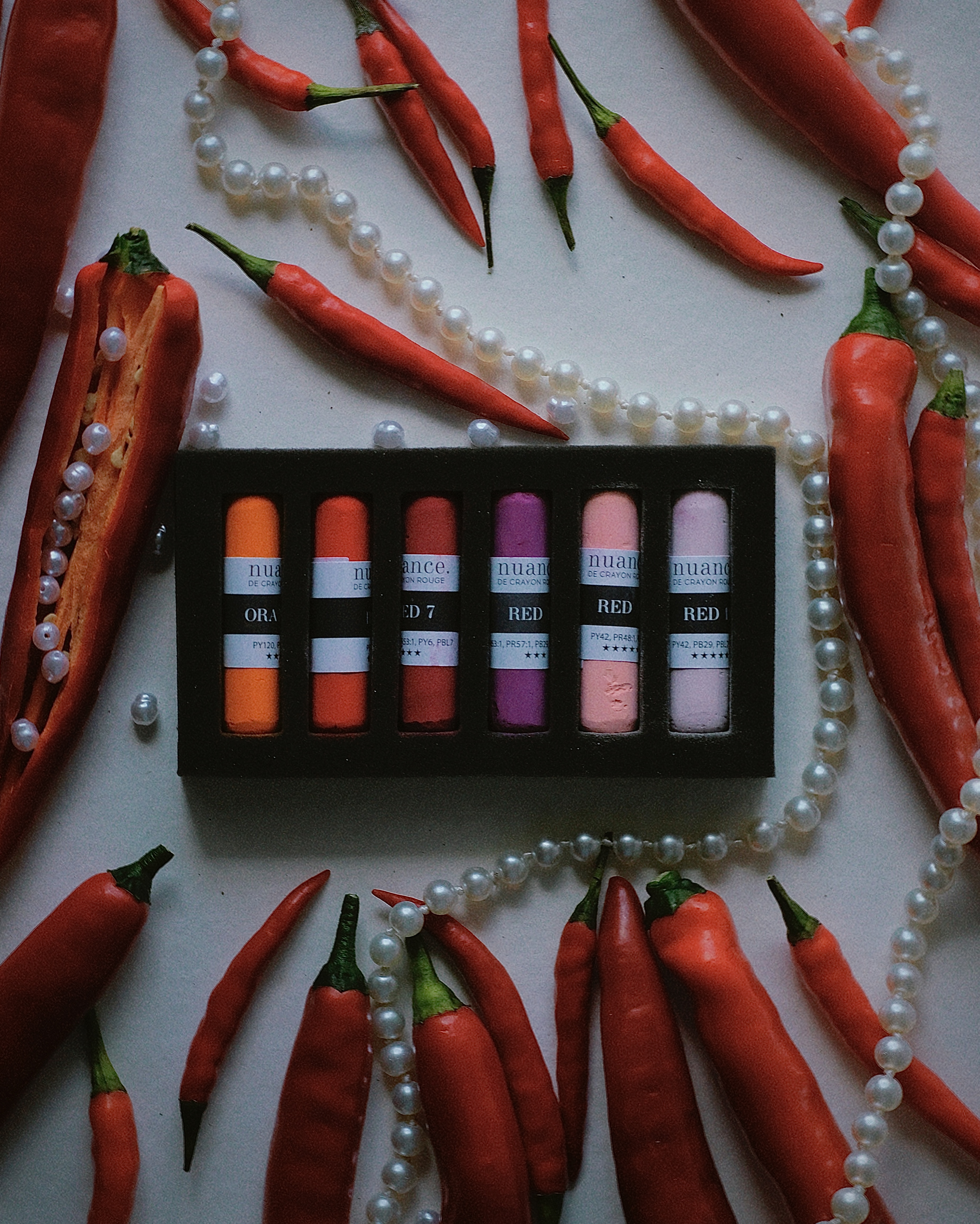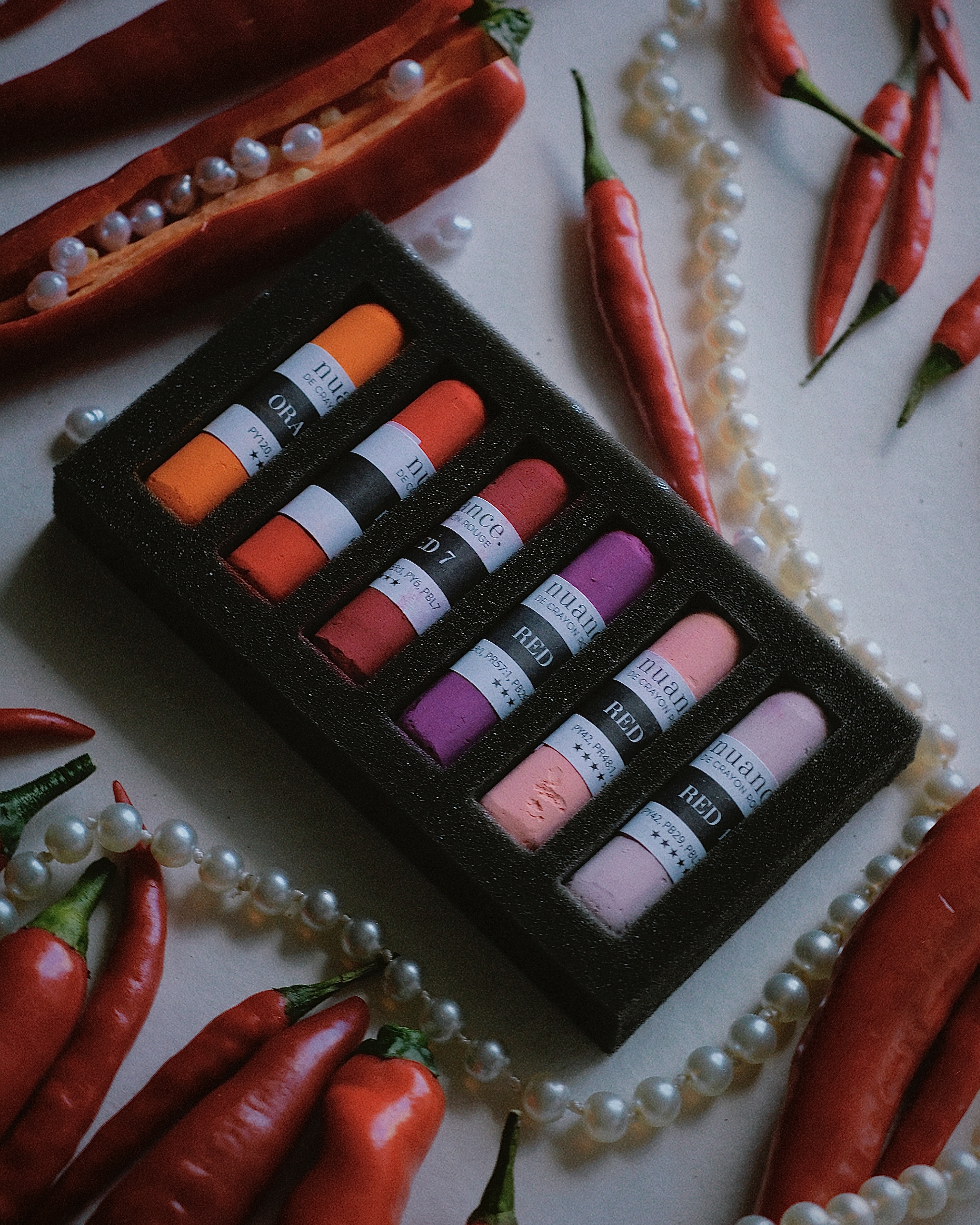Профессиональная сухая пастель nuance. изготовлена из пигментов премиум-класса с высоким уровнем светостойкости. Мягко разносится по поверхности, позволяет создавать плавные градиенты цвета. Подходит для профессиональных и студийных работ. Рекомендуем использовать на специализированной пастельной бумаге или на пастельной абразивной бумаге nuance. В коллекцию наборов пастели nuance. вошли оттенки из существующей палитры, собранные по цветовым группам. Мелки внутри набора находятся на ложементе из поролона для удобной транспортировки. Оттенки мелков в наборе: Orange 1 ***** Red 2 ***** Red 7 *** Red 14 *** Red 11 *** Red 18 *****
