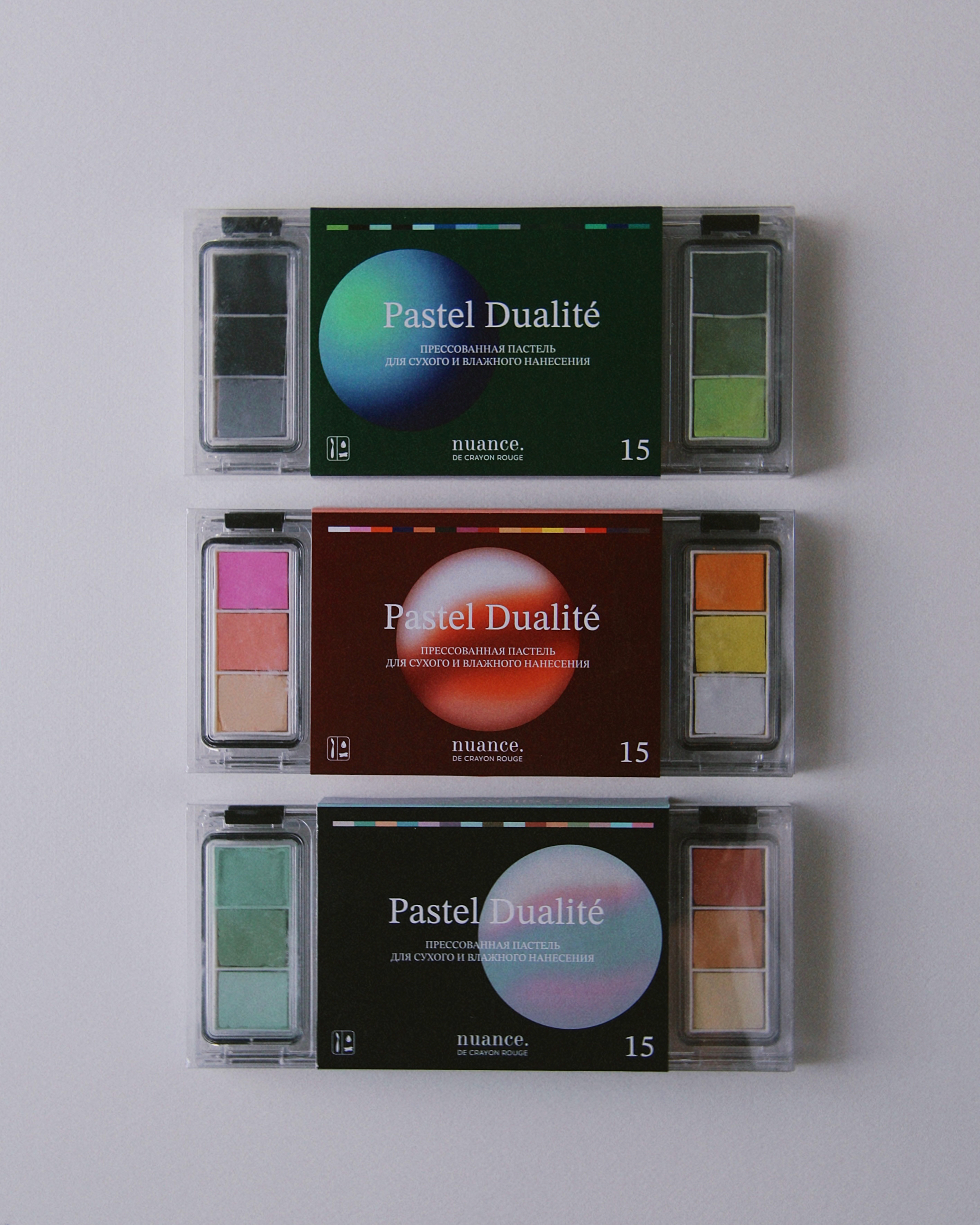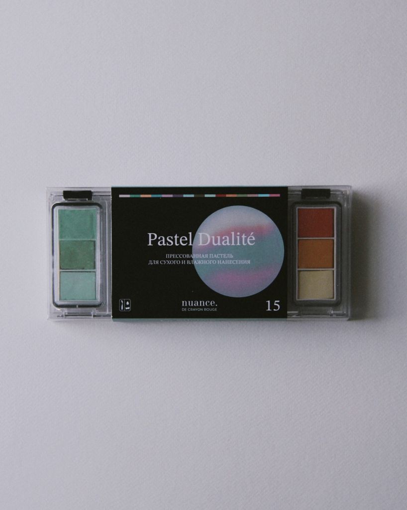 Прессованная сухая микс-медиа пастель Dualit? подходит для сухого и влажного нанесения. Название Dualit? отражает ее двойственную природу: наносите ее в сухом виде специальным мастихином для пастели или с помощью кисти, влажных спонжей — для получения насыщенных оттенков. В кейсе пятнадцать оттенков — по три в каждой секции. Секции открываются по отдельности и фиксируются механизмом-защелкой. Дополнительно защищены силиконовой герметичной прокладкой. В серию вошли три палитры: Палитра Le Silence / тишина состоит из мягких и деликатных пастельных оттенков. Она идеальна для передачи нежных, фантазийных сюжетов, предзакатной дымки, цветов. В набор вошли как теплые, так и холодные оттенки, которые позволят добиться драматичных и контрастных работ. Палитра La For?t / лес вдохновлена природными оттенками туманного леса, ботаническими сюжетами и прохладной водой рек и озер. Каждый оттенок представлен в нескольких вариантах контрастности, что позволяет добиться большей драматичности сюжета. Палитра L’Aube / рассвет вдохновлена закатным небом тропических островов. В нее вошли оттенки в основном красного спектра разной степени теплоты и холодности. Она идеальна для пейзажей с акцентом на ярком предзакатном или рассветном небе, жарком солнце или песке. Размер кейса: 9 х 20 см.