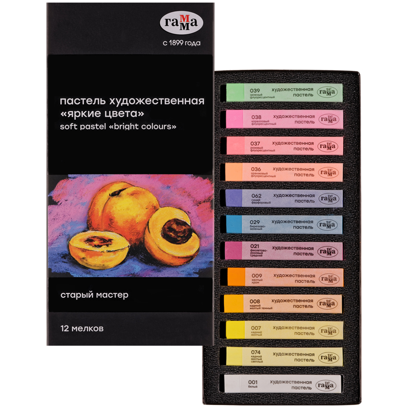 Сухая пастель — чистый пигмент, смешанный с водорастворимым связующим. Мягко ложится, не царапает бумагу, оставляет матовый бархатистый штрих. Насыщенные светостойкие цвета легко смешиваются и растушевываются, позволяя создавать тональные переходы. Пастель обладает средней мягкостью. Мелки квадратного сечения позволяют создавать как тонкие четкие линии, так и широкие штрихи. Каждый мелок упакован в индивидуальную бумажную обертку. Пастель производится в Корее. Цвета в наборе яркие, насыщенные, светостойкие, флуоресцентные цвета — устойчивые. Дизайн художественной пастели «Старый мастер» разработан совместно с известными российскими художниками-пастелистами. На упаковке набора картина Елены Суворовой «Персики».