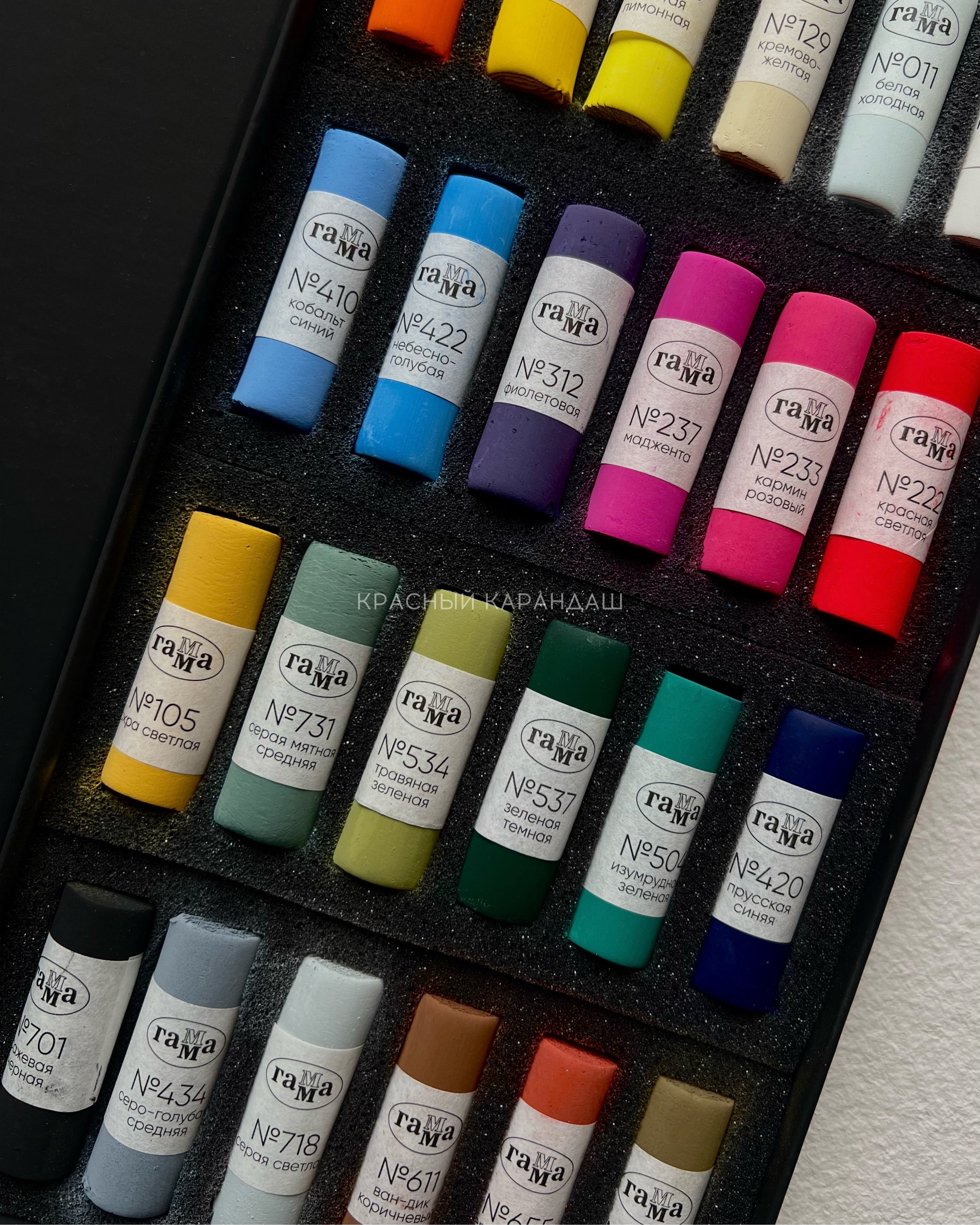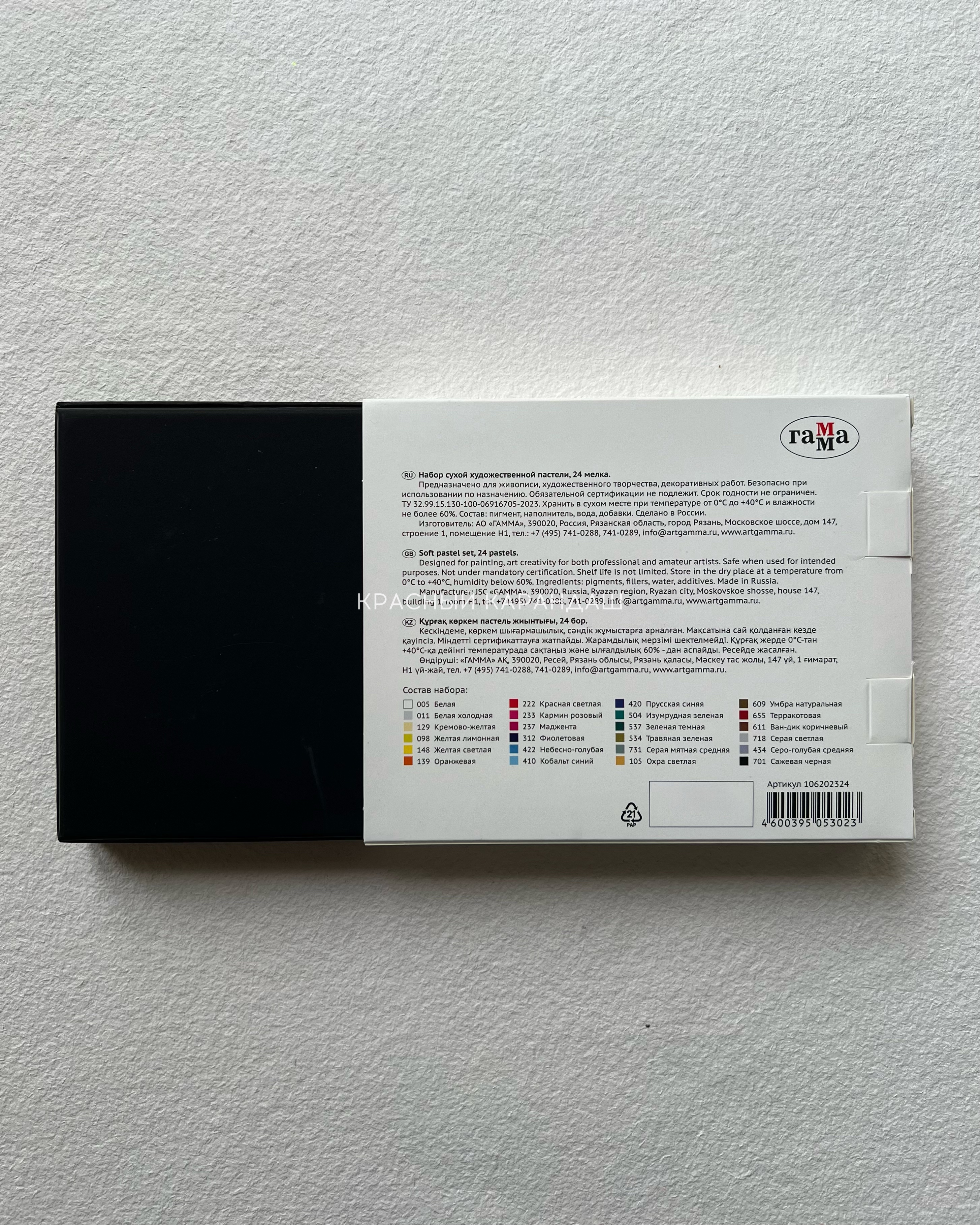 В наборе 24 мелка высокопигментированной мягкой художественной пастели «Гамма» основных цветов. Для производства пастели используются тонкотертые пигменты и каолиновая глина высочайшего качества. Каждый мелок круглой формы оптимально мягкий и в меру хрупкий. Диаметр мелка составляет 1,5 см, а длина – 4,8 см. Все мелки обладают насыщенными цветами, средней сыпучестью и высокой адгезией, легко растушёвываются и смешиваются между собой, позволяя создавать новые оттенки и плавные градиенты. Для работы с пастелью рекомендуется использовать специальную бумагу с ярко выраженной фактурой, готовую работу желательно закрепить специальным лаком-фиксативом.