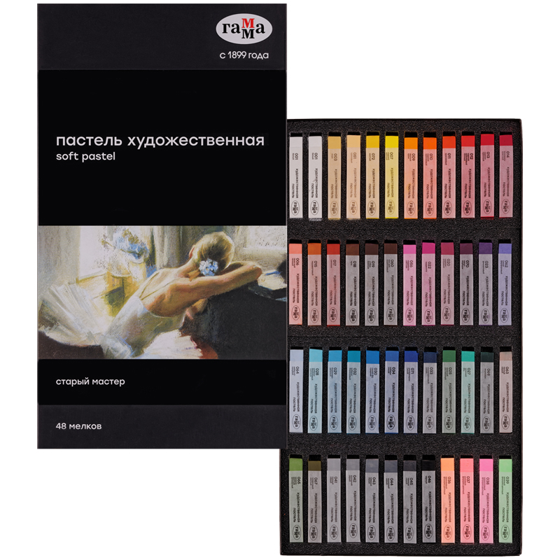 Сухая пастель — чистый пигмент, смешанный с водорастворимым связующим. Мягко ложится, не царапает бумагу, оставляет матовый бархатистый штрих. Насыщенные светостойкие цвета легко смешиваются и растушевываются, позволяя создавать тональные переходы. Пастель обладает средней мягкостью. Мелки квадратного сечения позволяют создавать как тонкие четкие линии, так и широкие штрихи. Каждый мелок упакован в индивидуальную бумажную обертку. Пастель производится в Корее. Дизайн художественной пастели «Старый мастер» разработан совместно с известными российскими художниками-пастелистами. На упаковке набора картина Анастасии Вострецовой «Отдых».