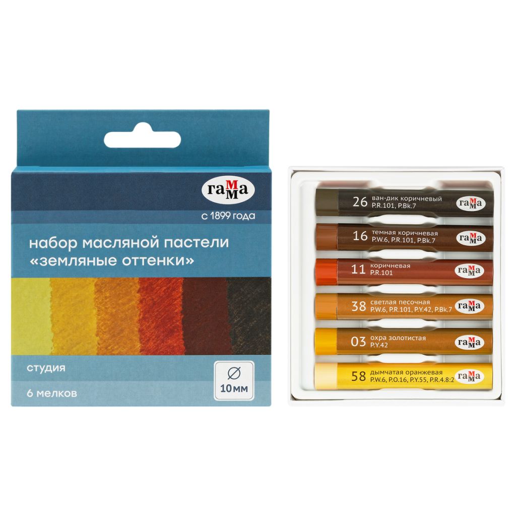 Масляная пастель «Студия» изготовлена на основе тонкотертых пигментов и минерального масла. Оставляет мягкий штрих, легко растушевывается. Яркие насыщенные цвета легко смешиваются, не светлеют и не темнеют со временем. Масляная пастель рисует на поверхностях разных фактур, не осыпается и не требует использования закрепителя краски. В наборе шесть мелков увеличенного диаметра. Толщина мелка 10 мм. Длина мелка 70 мм.